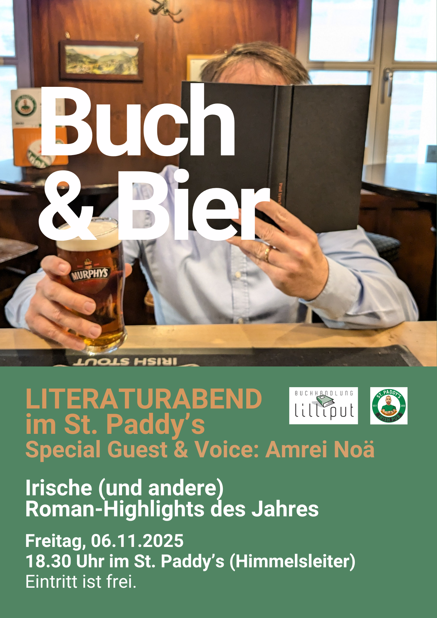 Lilliput goes Paddy’s! Am Donnerstag, den 06.11, nehmen wir uns einen Stapel Bücher aus der Buchhandlung mit in den Pub und präsentieren dort unsere irischen und angelsächsischen Roman-Highlights des Jahres! MIchael stellt vor und Amrei Noä liest.